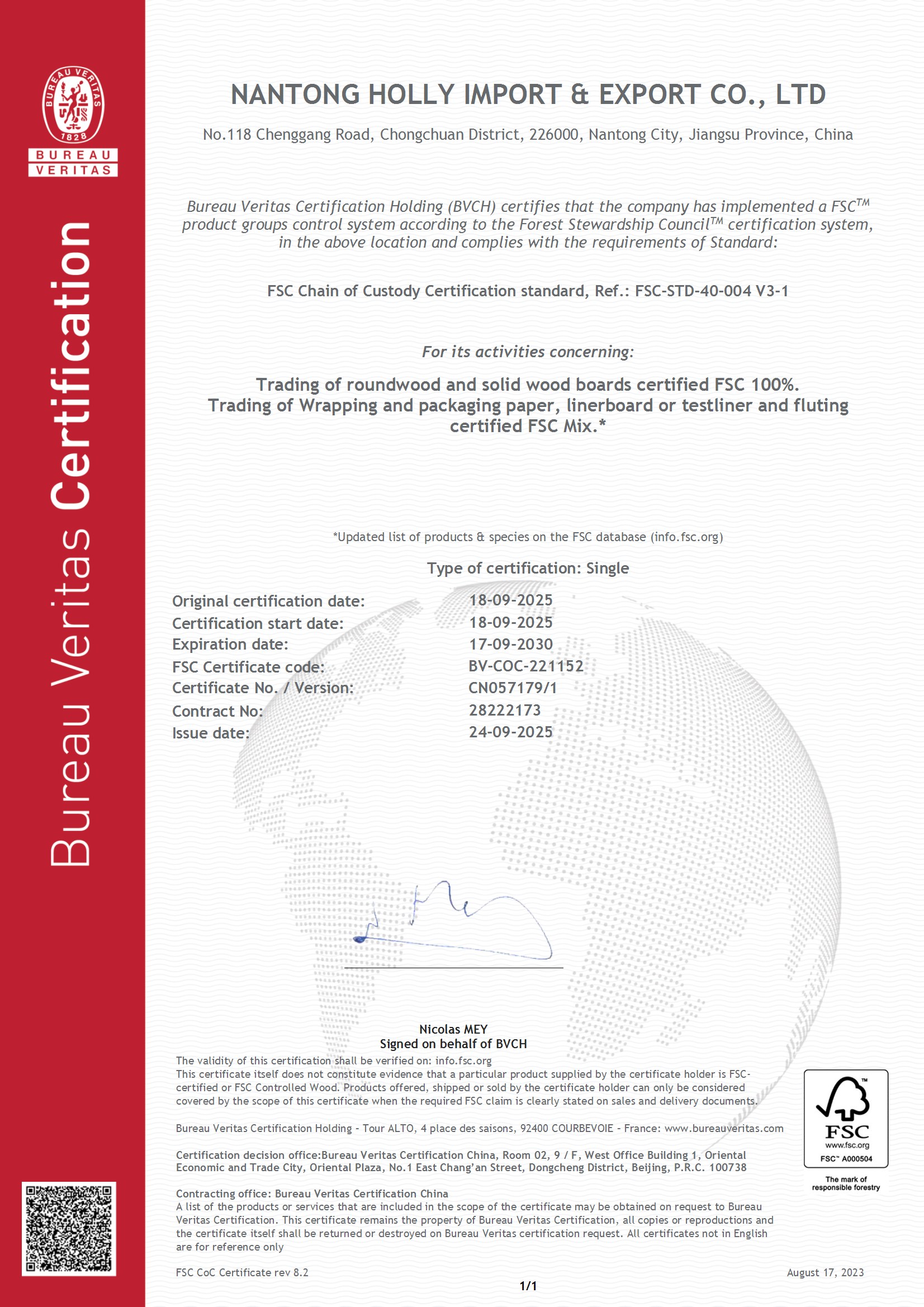 近日,南通弘業公司順利通過必維國際檢驗集團(Bureau Veritas)的嚴格審核,成功獲得FSC-COC認證。為達成認證要求,公司先后完成管理代表任命、體系評估、FSC基礎知識與標準專項培訓、體系文件搭建、分部門實操培訓及模擬訂單試運行等工作,以全流程合規化操作通過嚴苛審核。
