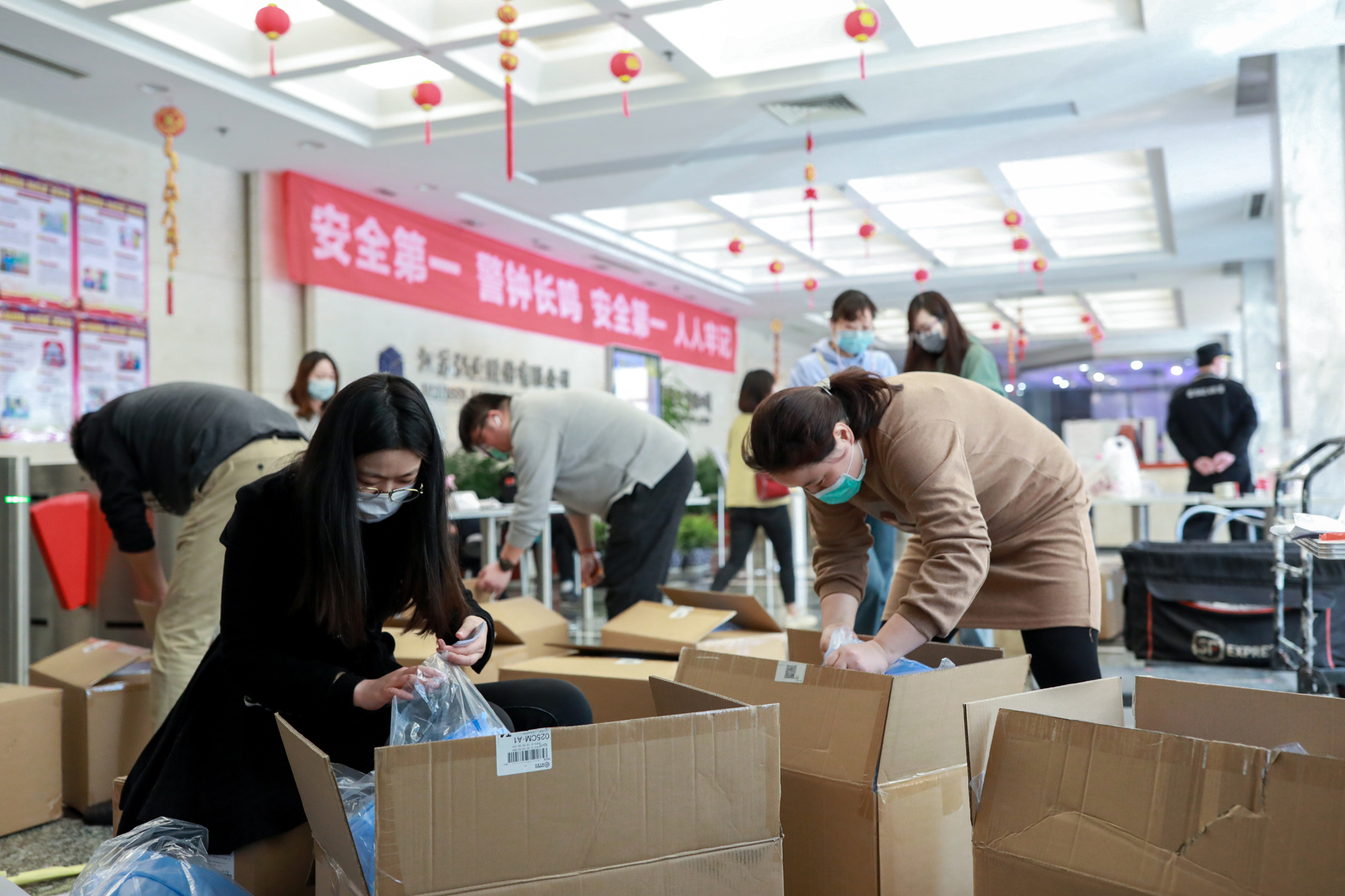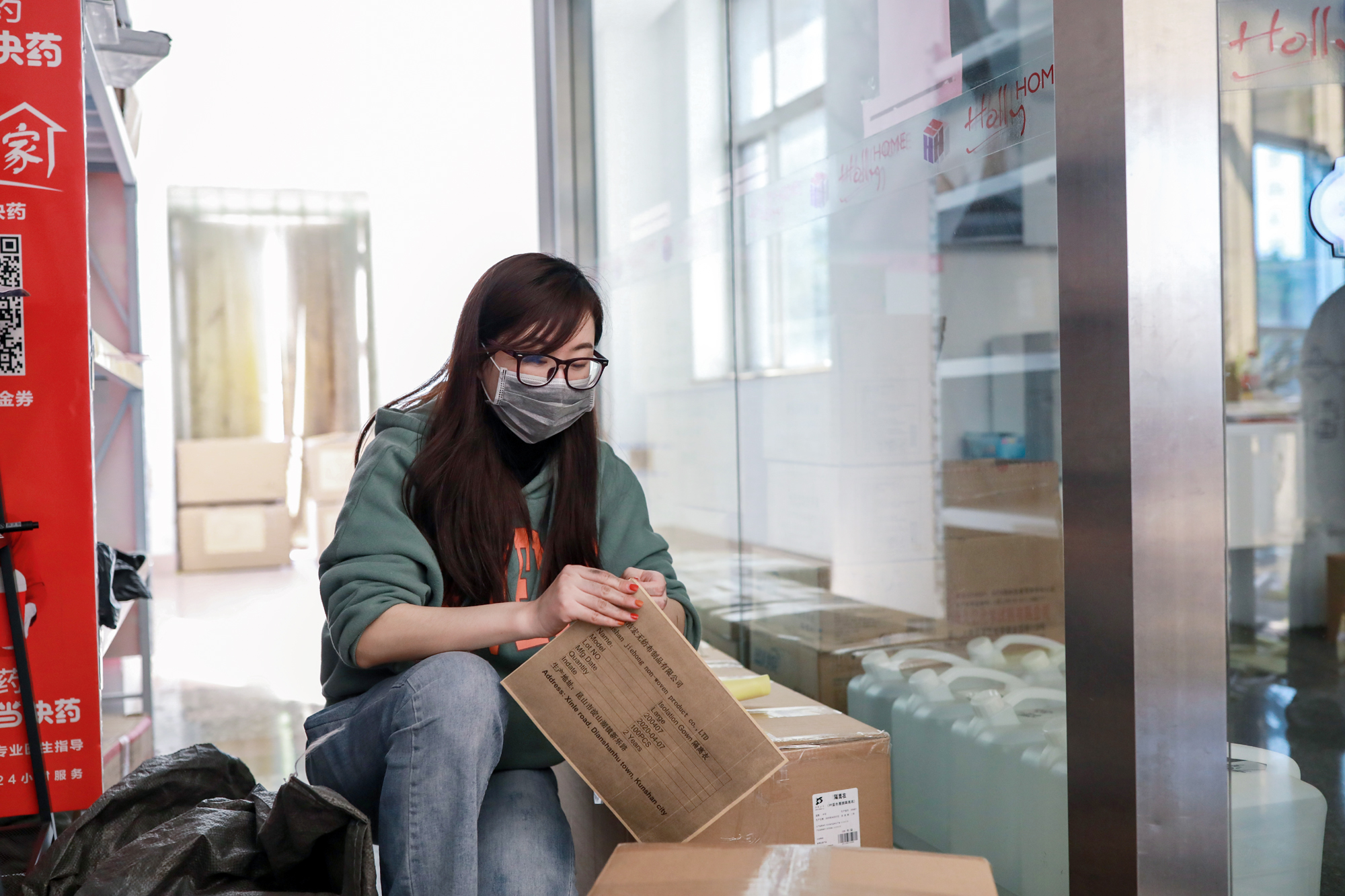 紡織行業(yè)是傳統(tǒng)勞動密集型、出口密集型行業(yè),受新冠肺炎疫情沖擊較大。同時,國外疫情防控和復工復產(chǎn)急需大量口罩、防護服等防疫物資。面對“多重”壓力,江蘇弘業(yè)永為國際貿(mào)易有限公司業(yè)務員陳瑩抓住機遇,迎接挑戰(zhàn),多方協(xié)調國內(nèi)外資源,出口口罩、防護服等防疫物資。圖片展現(xiàn)了陳瑩和她的同事們一起緊鑼密鼓地幫忙包裝防疫物資,為及時出口防疫物資贏得了保障。體現(xiàn)了弘業(yè)人有責任、有擔當、共進退的精神風貌。